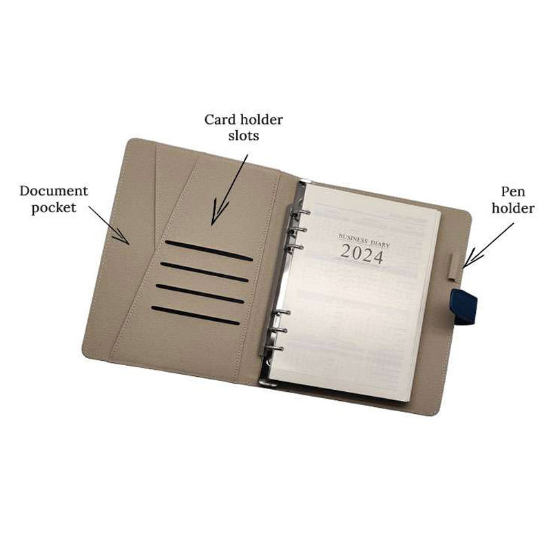 This A5-sized suede finish organizer includes daily dated inserts for the current year, designed for professionals who value structure and style. The hard cover ensures durability, and the spiral binder allows smooth and practical use throughout the year.