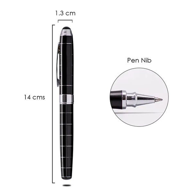 This roller pen features a sleek black lacquered body with a silver grid design and matching silver trimmings. The slim profile ensures a comfortable grip, making it suitable for boardroom use, corporate gifting, or executive giveaways.