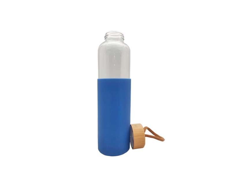 Eco-friendly reusable bottle made from borosilicate glass with a protective silicone sleeve and bamboo lid.