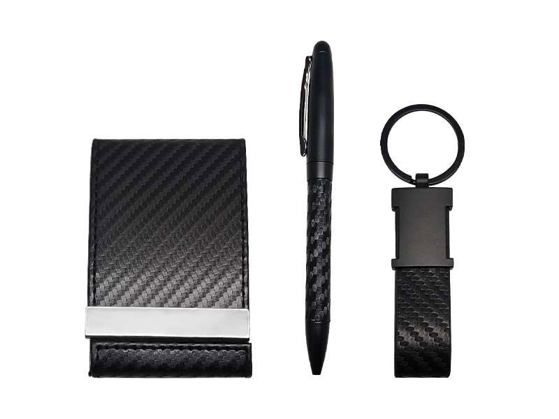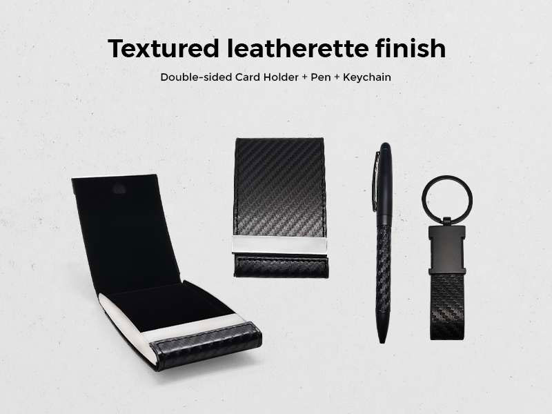 This elegant gift set includes a black leatherette card holder, matching pen, and keychain, all packed in a sleek presentation box. The textured leatherette finish and metallic details give the set a polished, professional look, making it ideal for corporate gifting.