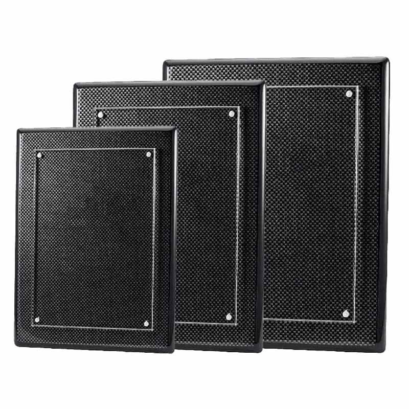• Wooden Plaques with Transparent Acrylic Sheet – Featuring a magnetic acrylic panel mounted on rosewood bases with lacquered piano gloss or a carbon fiber look. Available in three sizes: