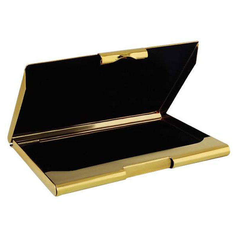 This sleek business card holder is crafted from durable metal and finished in a luxurious gold tone, offering a refined way to store and present your cards. Measuring 9.5 x 6 cm, it fits easily into pockets or bags while keeping your cards neatly organized. Ideal for corporate gifting and promotional use, this elegant accessory can also be customized with your company branding to create a lasting impression.