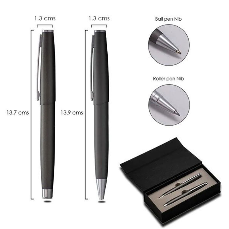 This matte grey pen set includes a roller pen and a matching ballpoint pen, both designed for a refined writing experience. Presented in an elegant gift box, it is a fitting choice for executive gifting or premium corporate giveaways.