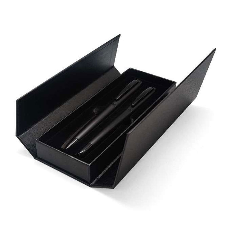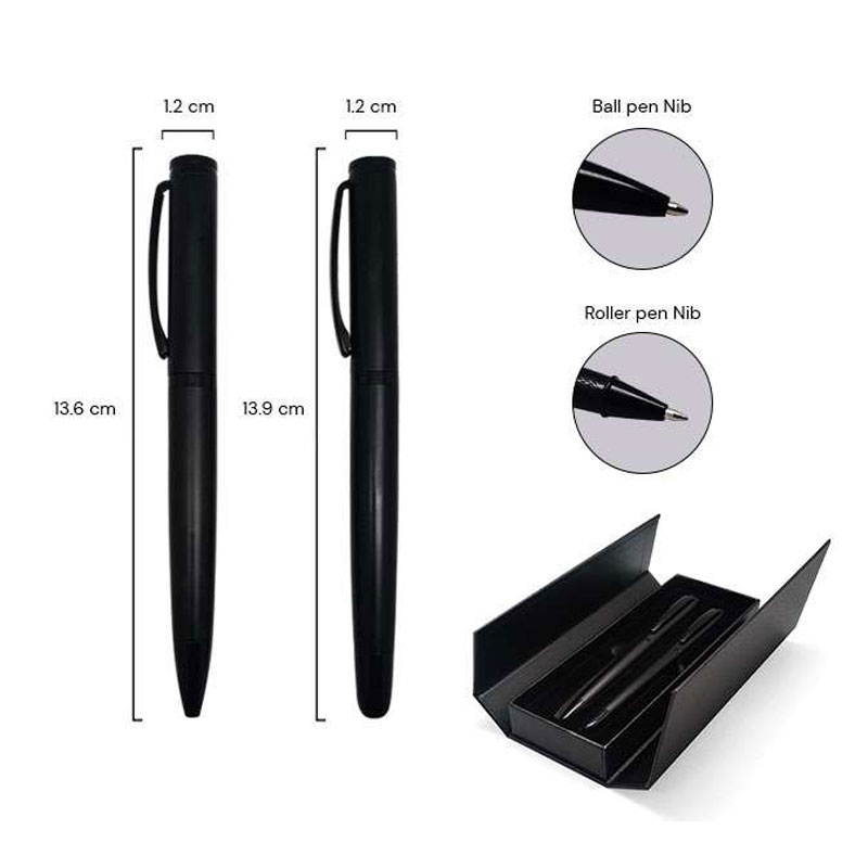 This elegant pen set includes a matt black roller pen and a matching twist-action ballpoint pen, both crafted from durable brass alloy for a premium feel. The roller pen measures 13.9 cm, while the ballpoint pen is 13.6 cm in length. The set comes neatly packaged in a 16 cm gift box, making it a refined choice for executive gifting or promotional use. With its sleek design and solid construction, this set is ideal for professionals who appreciate both style and functionality.