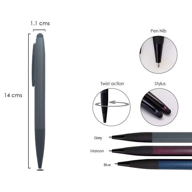 A twist-action ballpoint pen with a smooth matte finish and integrated stylus for touchscreen use. Minimal and professional in appearance, ideal for branding and corporate gifting.