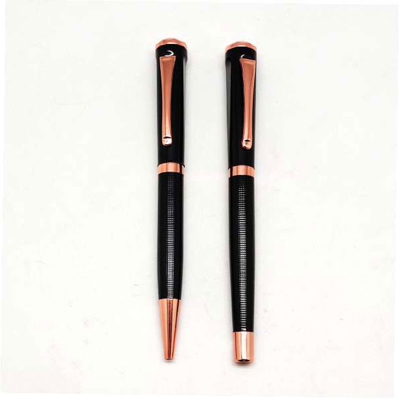This elegant pen set includes a roller pen and a matching ballpoint pen, both crafted from metal with a stylish black finish and copper accents. Designed for professionals, it adds a refined touch to any corporate setting or promotional event.