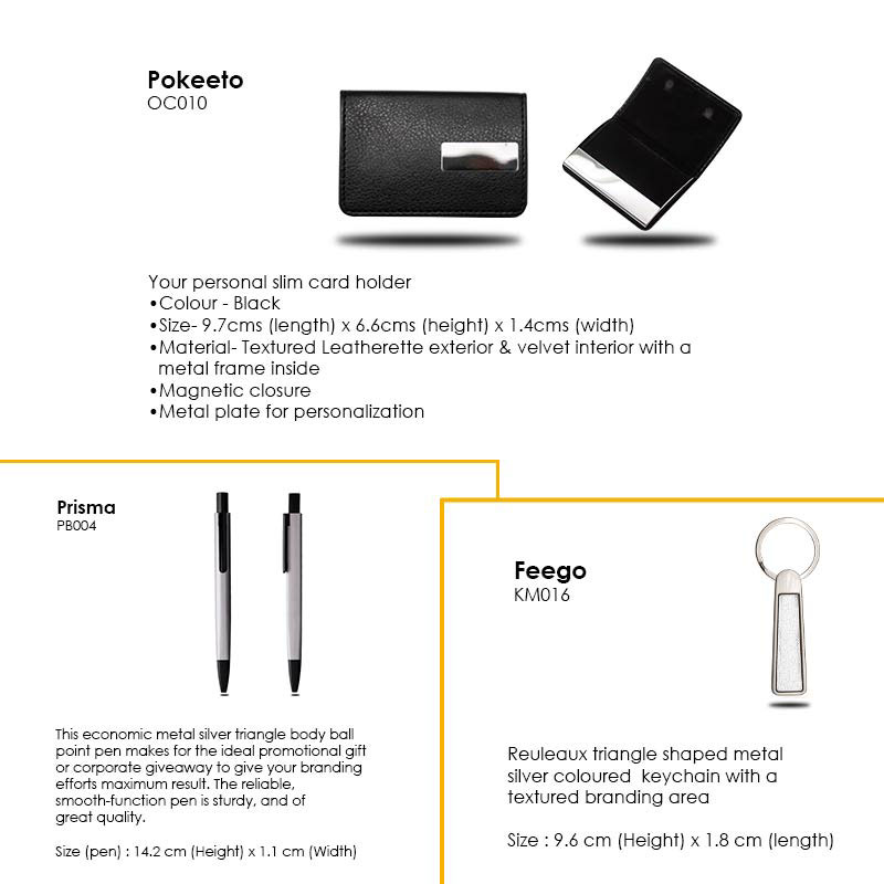This elegant corporate gift set includes a textured leatherette card holder, a sleek metal ballpoint pen, and a chrome keychain—combining style and practicality in one polished package. The black and silver theme gives the set a premium look, perfect for business settings or executive gifting.